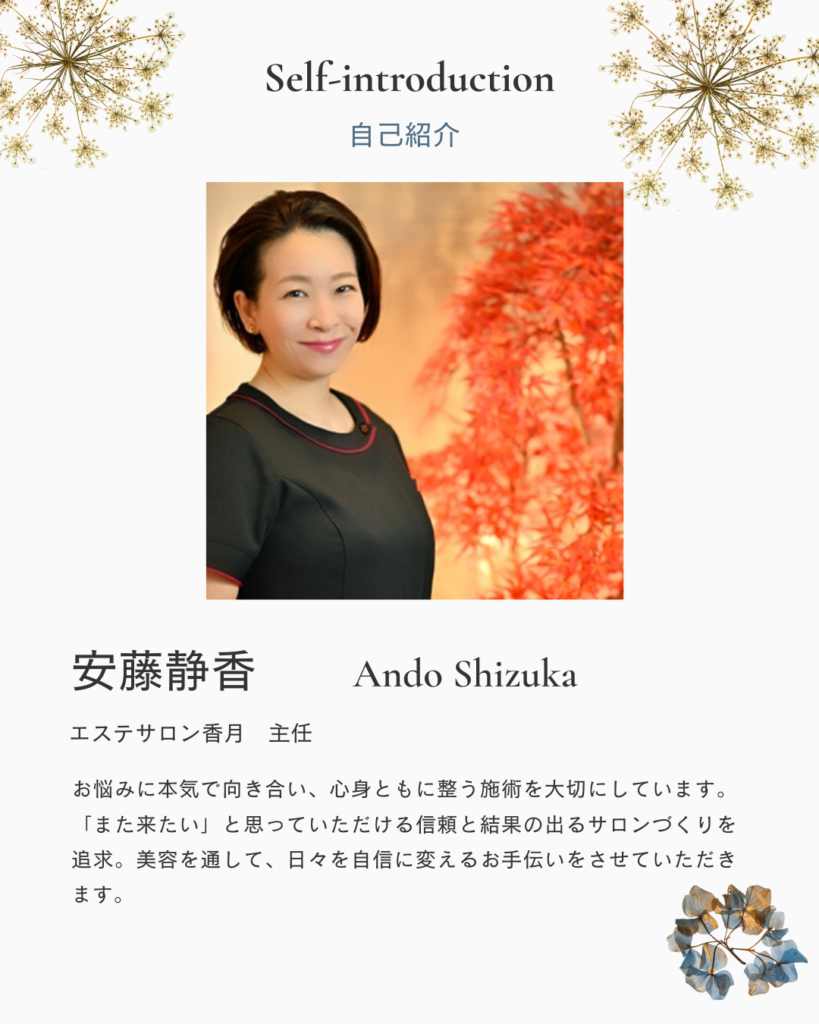 施術の時間が「安心できるひととき」となり、帰る頃には「また来たい」と思っていただけるよう、技術だけでなく空間や会話の心地よさにも心を配っています。これからも、温かな手を通して癒しを届け、皆さまが笑顔で過ごせるお手伝いができれば幸いです。どうぞよろしくお願いいたします。