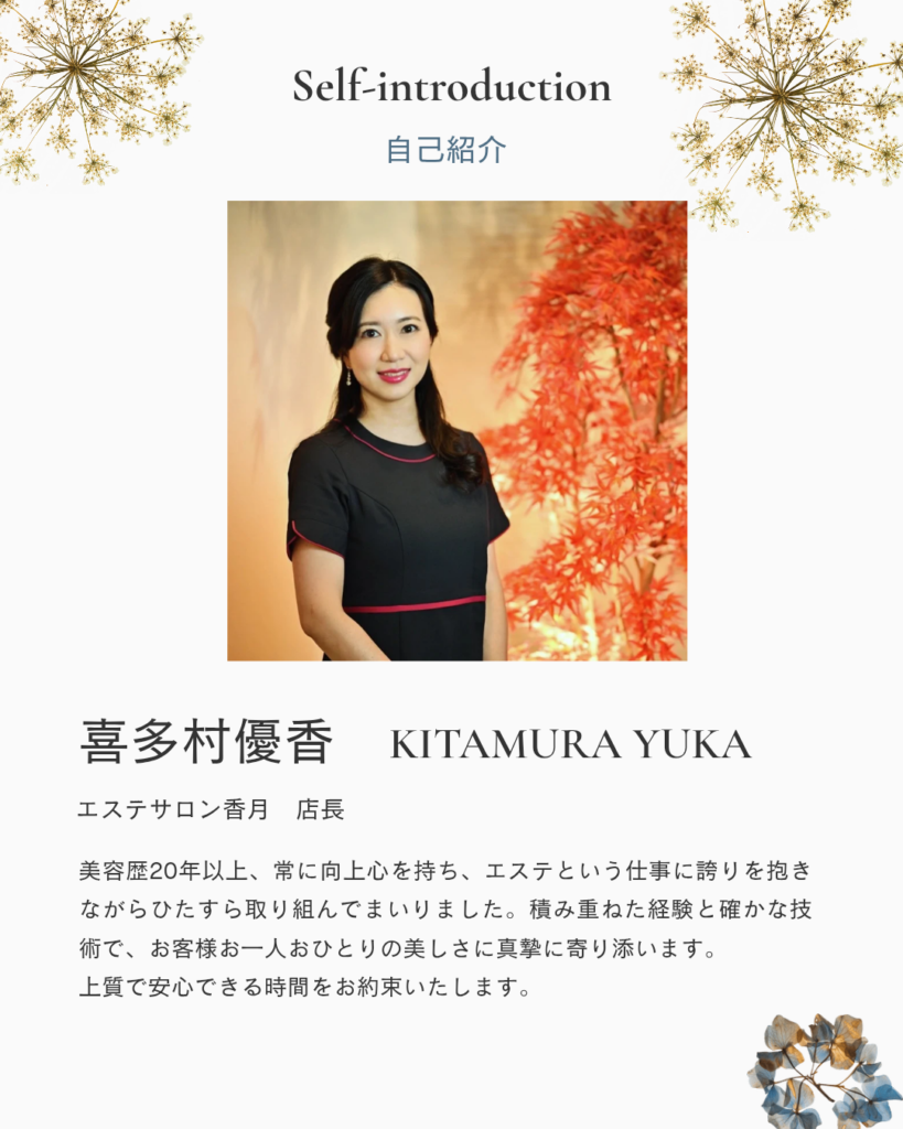 美しさとは外見の輝きだけでなく、心の充足や自信にもつながるものです。だからこそ私は、単なる施術にとどまらず、お客様の想いに寄り添い、心とお肌を共に整えていく「二人三脚の美容」を大切にしています。
