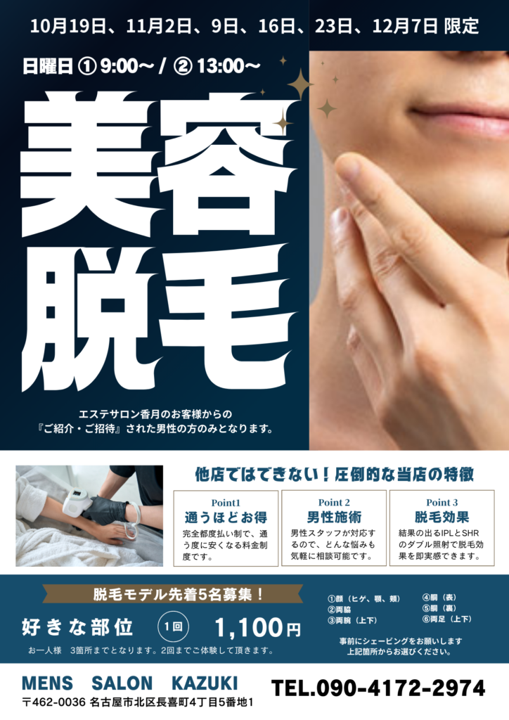 この度、お客様のお声や色んなご縁があり日曜日限定で、ご紹介制のメンズ脱毛を開始することになりました。