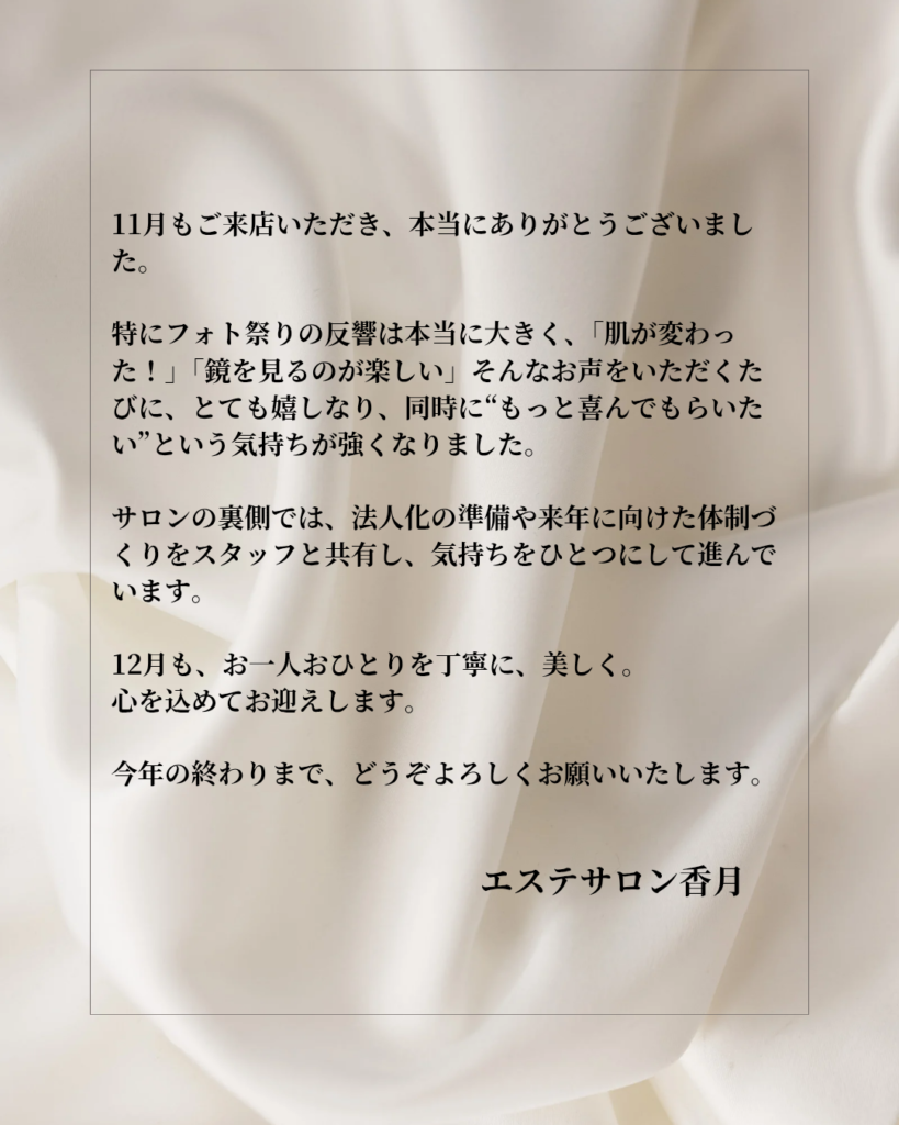毎年恒例のフォト祭りは、今年もたくさんの反響をいただき、お客様の肌がどんどん変わっていく瞬間を間近で見られることが、私にとって何よりの喜びでした。