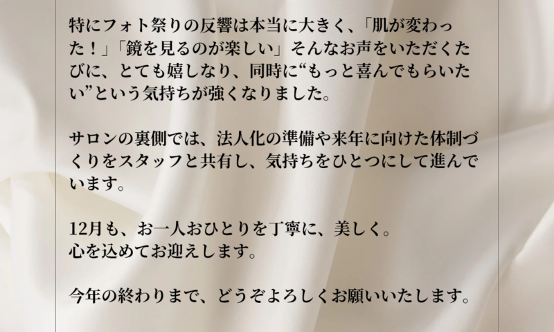 毎年恒例のフォト祭りは、今年もたくさんの反響をいただき、お客様の肌がどんどん変わっていく瞬間を間近で見られることが、私にとって何よりの喜びでした。