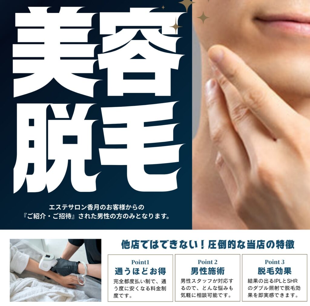 ※メンズ脱毛に関しては、エステサロン香月に通われているお客様のご紹介、またはご招待を受けた方のみご利用頂ける『完全紹介制・ご招待制』サロンとなります。