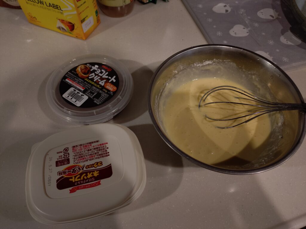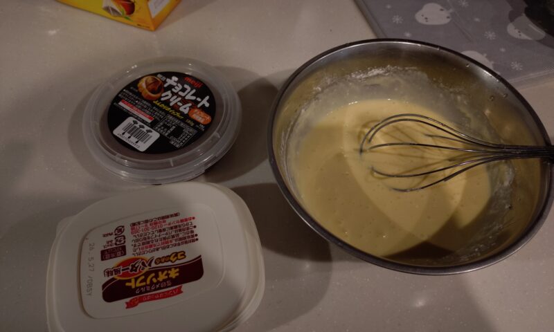 結局、材料買いに行かず、キッチン物色したらホットケーキミックスを発見。