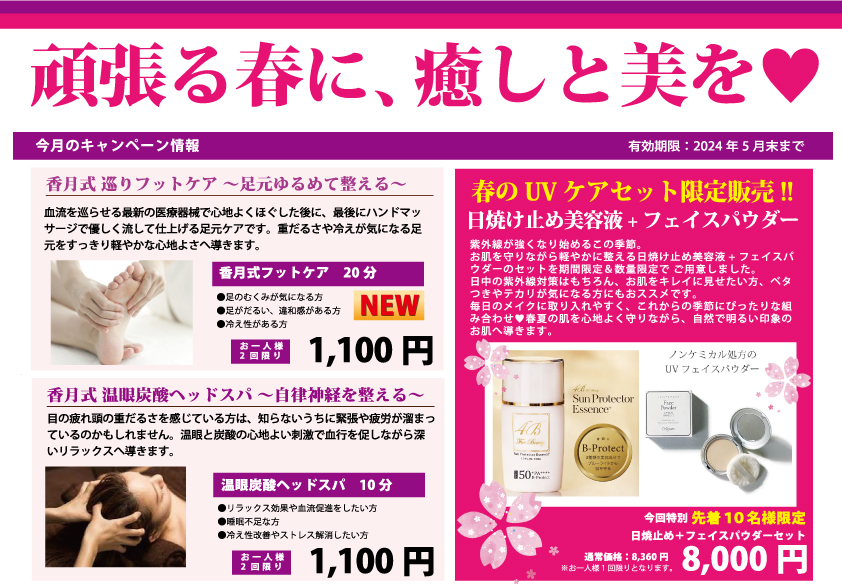 香月ではこの春、「癒し」と「美しさ」の両方を大切にしたキャンペーンをご用意しました。