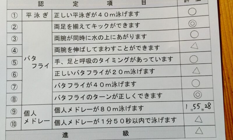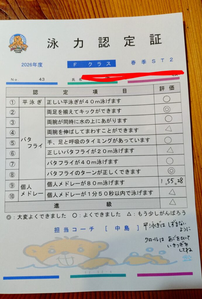 しかもコーチからは、「平泳ぎはしずまないように」「クロールはあごをひいていきつぎをしてね」と、ちゃんと課題も書いていただいていて、 見てもらえている感じは本当にありがたい。